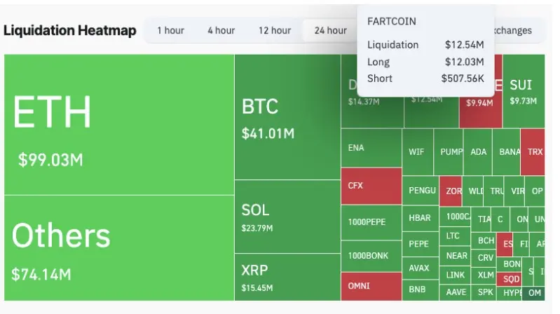 Over the past 24 hours, the steep decline has led to $12.4 million in liquidations from FARTCOIN long positions, the second-highest liquidation volume among memecoins during this period.