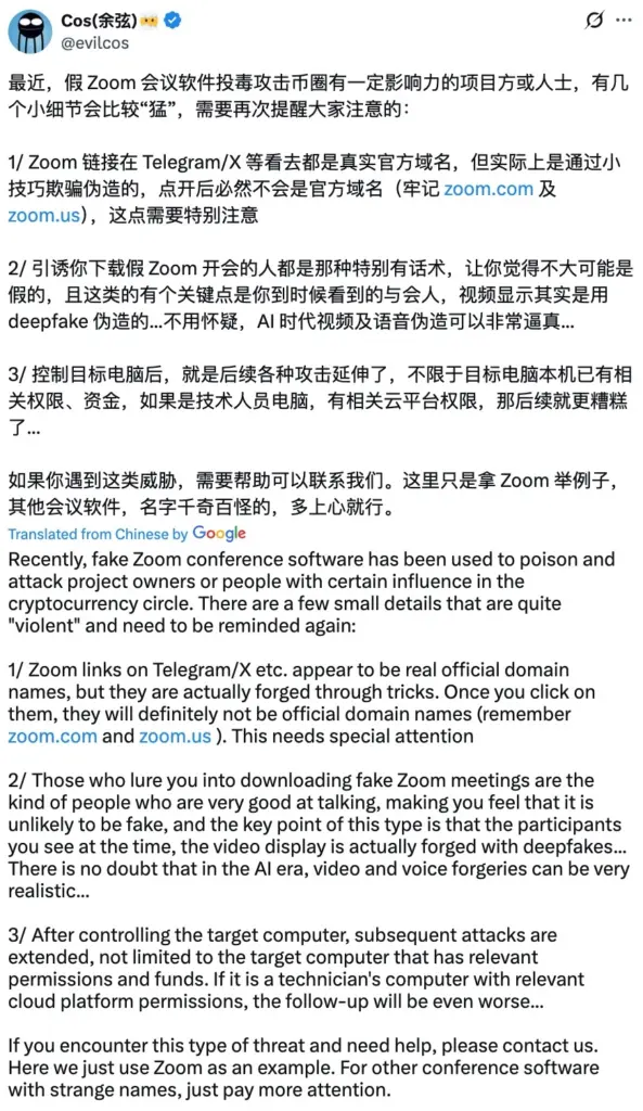 SlowMist CEO Yu Xian advised users to confirm the authenticity of Zoom URLs and domain names to prevent becoming victims of video-based impersonation schemes.
