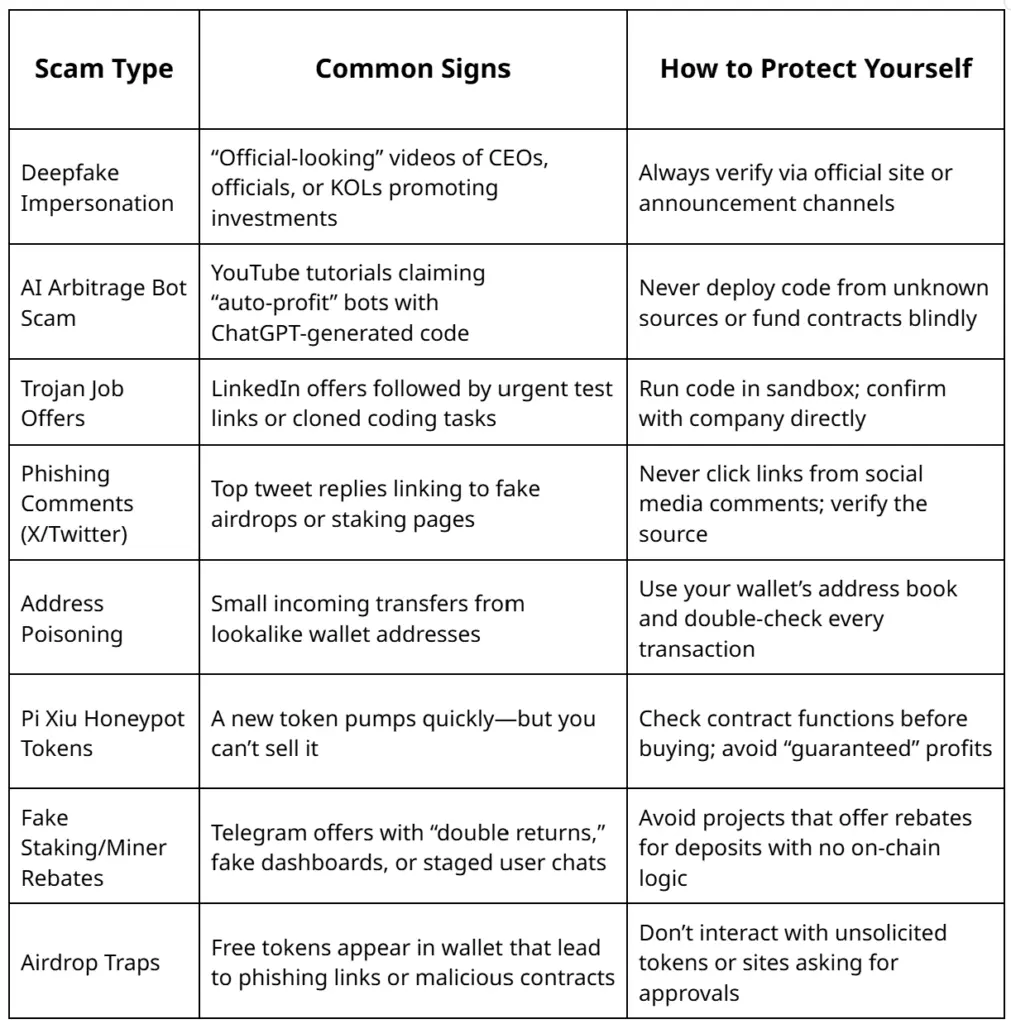 The research describes the structure of contemporary cryptocurrency scams, identifying three main types: social engineering schemes, Ponzi-style frauds masquerading as decentralized finance (DeFi) or GameFi initiatives, and AI-generated deepfake impersonations. It cautioned that deepfakes are particularly challenging to identify.