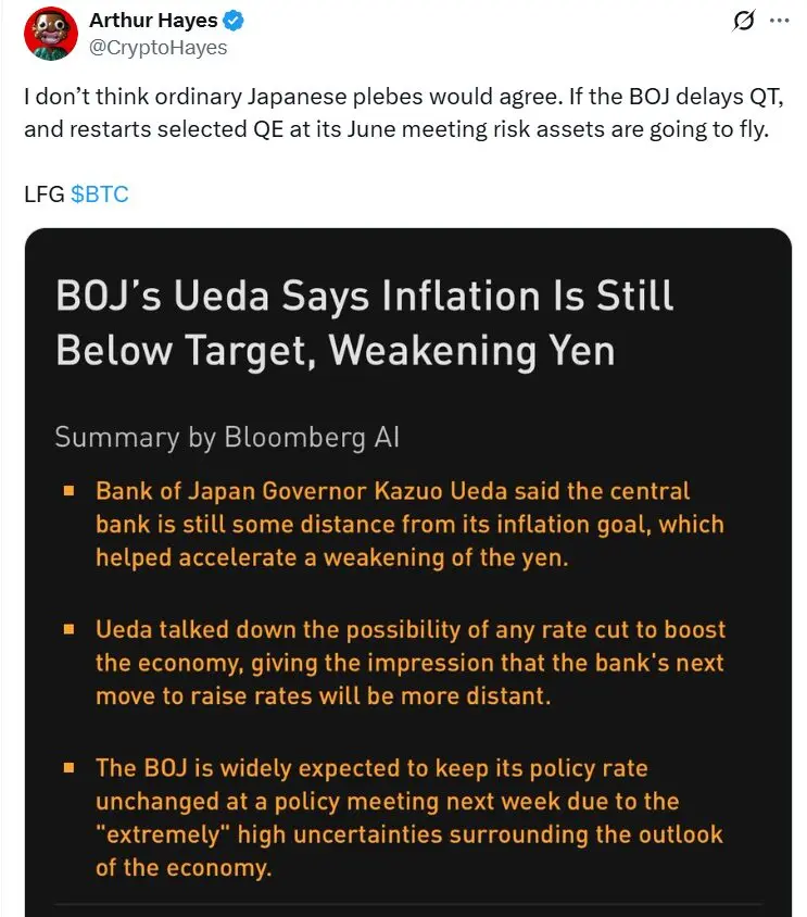 “If the BOJ delays QT and restarts selected QE at its June meeting, risk assets are expected to soar,” Hayes stated in a June 10 X post.