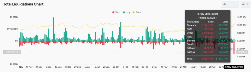 Traders were taken aback when the price of Bitcoin surpassed $103,000, as the market experienced subsequent large-scale liquidations. Short sellers were the most severely affected, as their positions were eliminated in 24 hours, totaling more than $1 billion.