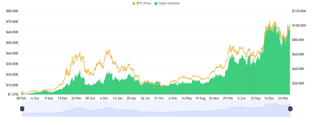 The open interest in Bitcoin futures has increased to $67.4 billion. Sharp corrections are frequently the result of this level of leverage when prices decline. Consequently, traders are intently monitoring critical support levels. Long positions could rapidly unwind if Bitcoin descends below them. This would result in a series of liquidations and volatility.