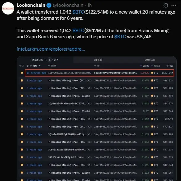 At the current price of Bitcoin, a Bitcoin whale with the wallet address “16yr3M” has emerged from hibernation and transferred 1,042 BTC, or $122.54M.