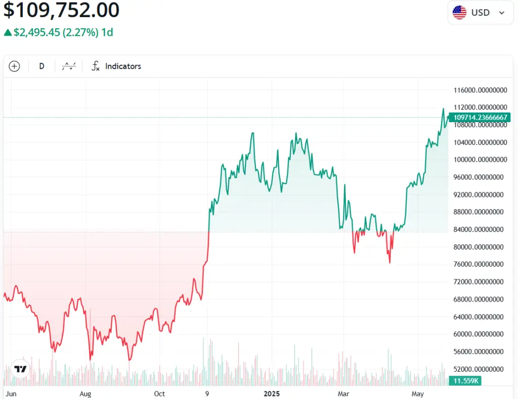 According to Cointelegraph data, the price of Bitcoin, which is currently trading at $109,661, reached a new all-time high of $112,000 on May 22 before retreating to trade above $109,700 at the time of writing on May 26.