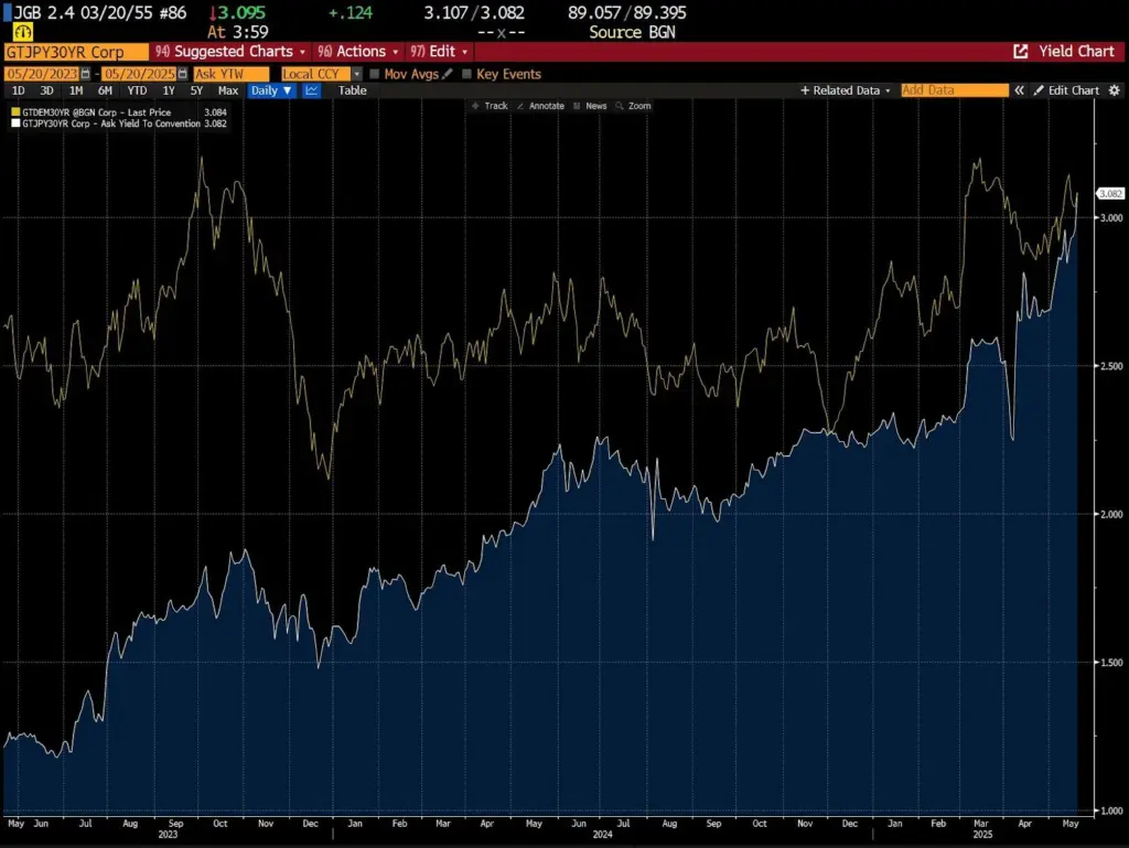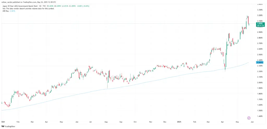 According to TradingView statistics, on May 20, 2025, the 30-year yield on Japanese bonds hit a new all-time high of 3.185% before falling to 3.115% on May 23.