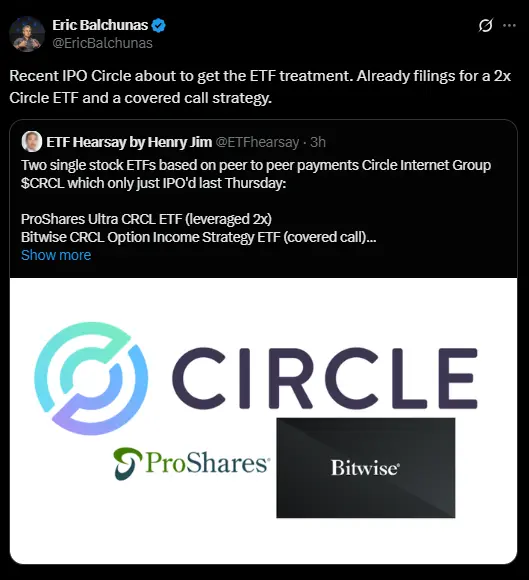 Circle stock CRCL, which was launched on Thursday, is also investigating the exchange-traded funds sector, as indicated by a recent X post shared by Bloomberg analyst Eric Balchunas. According to reports, the stock is preparing to introduce two new single exchange-traded funds: the ProShares Ultra CRCL ETF, which will have a 2x leverage, and the CRCL income ETF from Biwise, which is designed to implement a covered call strategy.