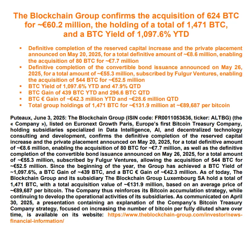 The Blockchain Group said in a June 3 X post that the most recent acquisition increases the company’s overall holdings to 1,471 Bitcoin, or more than $154 million, with a BTC yield of 1,097.6% YTD.