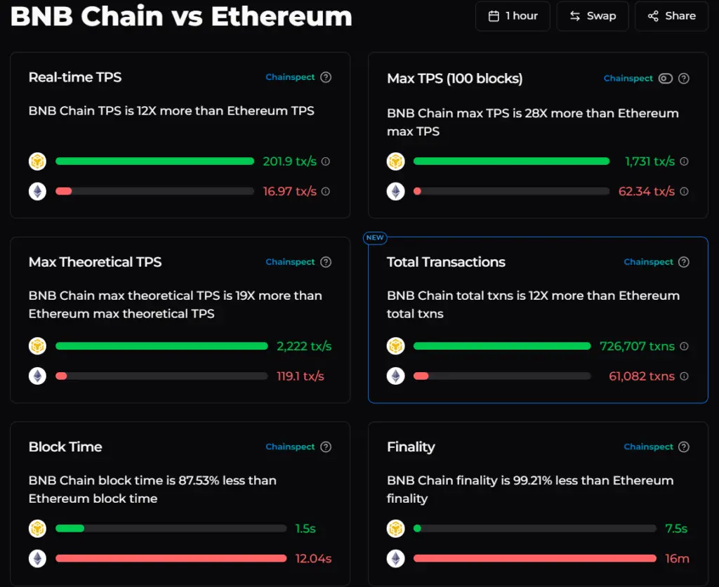 BNB Chain vs Ethereum on TPS, block time, and finality metrics. Source: Chainspect