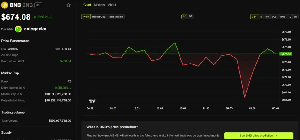 Nevertheless, despite this news, the BNB price has only increased by a modest 0.05% in the past 24 hours. It was trading at $674.08 at the time of this writing.