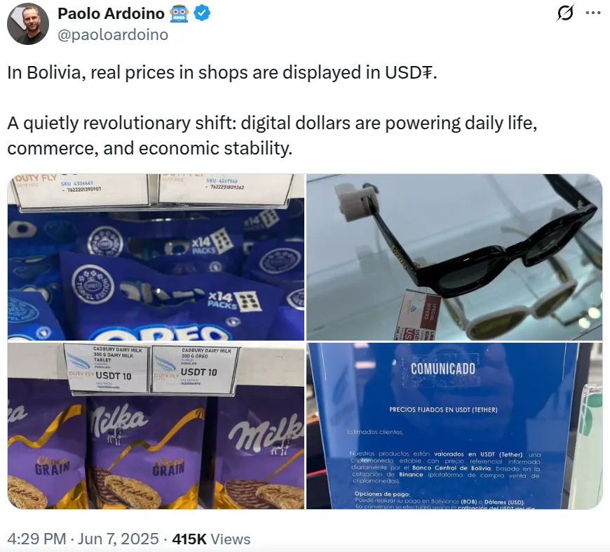 Images of duty-free Bolivian goods priced in USDT were posted by Tether CEO Paolo Ardoino, indicating the stablecoin’s increasing use as a benchmark currency in a faltering economy.