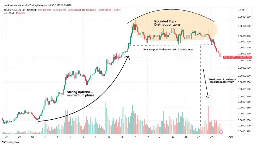 The rounded top resolved into a distinct breakdown once the $0.00003000 support failed, following multiple rejections near $0.00003800.