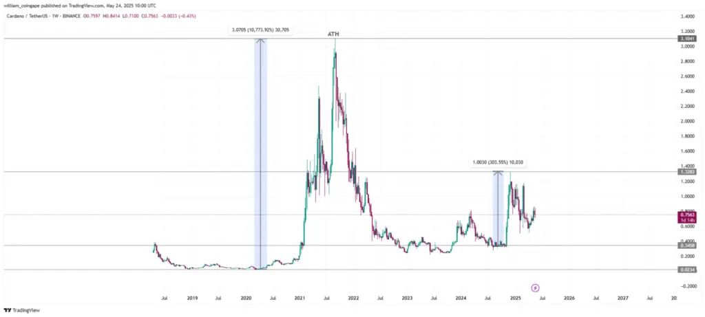 From $0.03 to an all-time high of approximately $3.10 during the 2020–2021 bull cycle, ADA experienced an explosive growth of more than 10,000%.