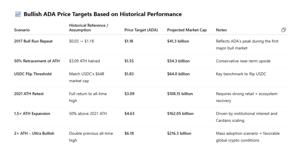 The AI bot also provided the following price targets that could increase the value of ADA before USDC’s current $61 billion market valuation.