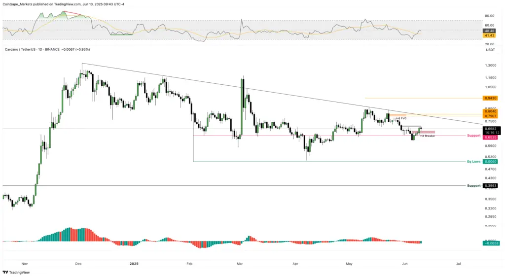 This negative trend has generated five distinct lower highs. Nevertheless, ADA has established a higher low at $0.511 on April 7 and $0.616 on June 5, following the swing low of $0.506 from February 3.