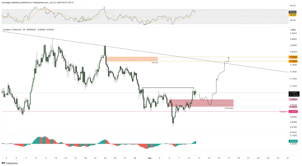 The aforementioned supply zone was transformed into a bullish breaker on June 9 due to the 8.41% increase in Cardano price from $0.660 to $0.715.