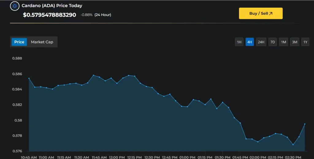 Cardano is trading at $0.5795, down 0.88% in the last 24 hours and 7.97% over the past week, remaining over 80% below its all-time high of $3.