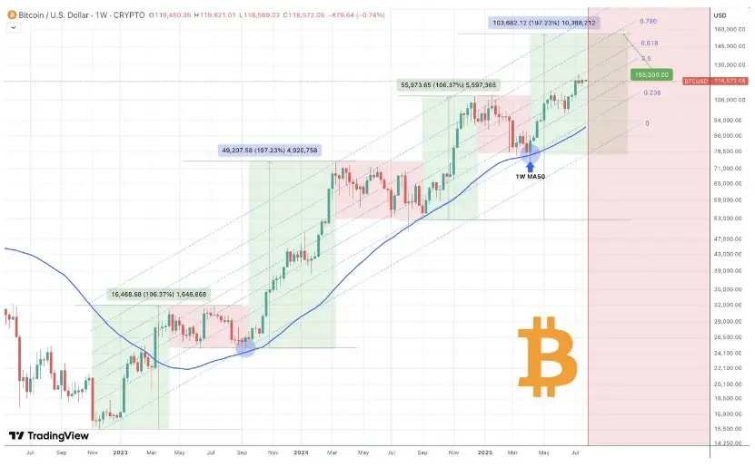 Technical analysis indicates that a prospective third leg, which is expected to reach $155,500 by October, indicates a similar mathematical progression within the established channel structure.