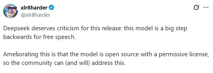The developer stated, “Deepseek warrants reproach for this release: This model represents a significant regression for free speech.”