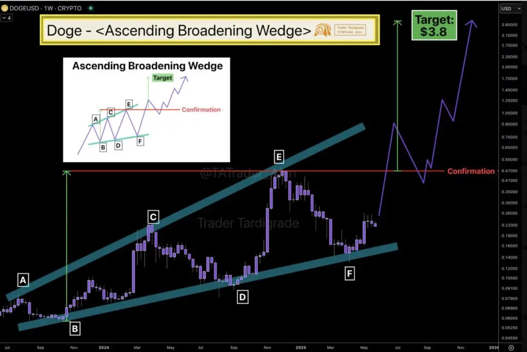 He formulated this perspective based on the ascending broadening wedge pattern, following DOGE’s rebound from the lower support level.