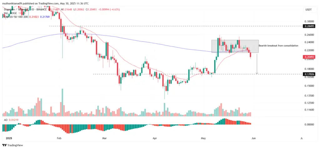 Due to the persistent downturn, Dogecoin has executed a bearish breakout from the consolidation area of $0.21 to $0.24.