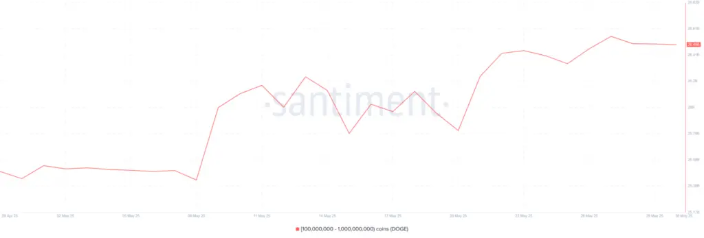 Over the past two days, substantial Dogecoin addresses possessing between 100 million and 1 billion tokens have diminished their holdings from 26.55 billion to 26.49 billion DOGE.