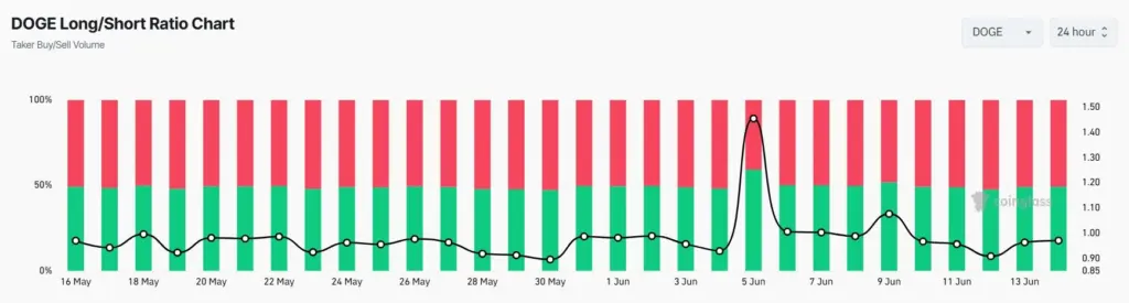 The Dogecoin market is dominated by short sellers, as evidenced by Coinglass’ data on the derivatives market. This suggests that most futures traders are wagering against Dogecoin’s price performance and expect it to decline.