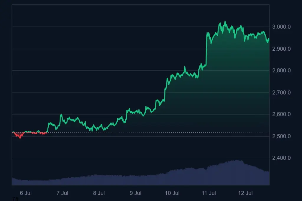 Due to this rise, Ethereum reached the psychological $3,000 mark on July 11 and appears poised to strike new highs.