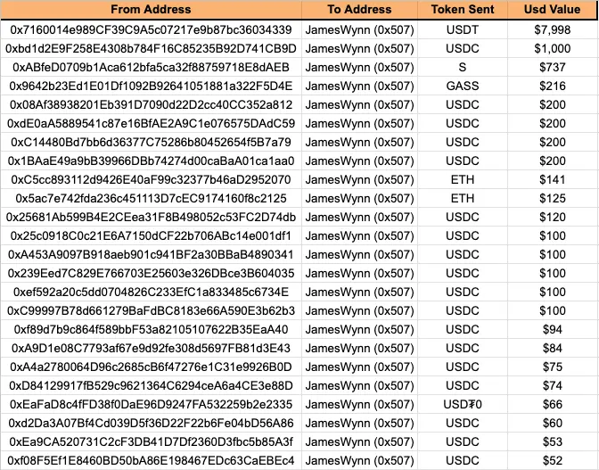 Data gathered by the pseudonymous blockchain detective “detective” shows that at least 24 blockchain users transferred stablecoins to Wynn’s cryptocurrency address, with the greatest gift almost totaling $8,000.