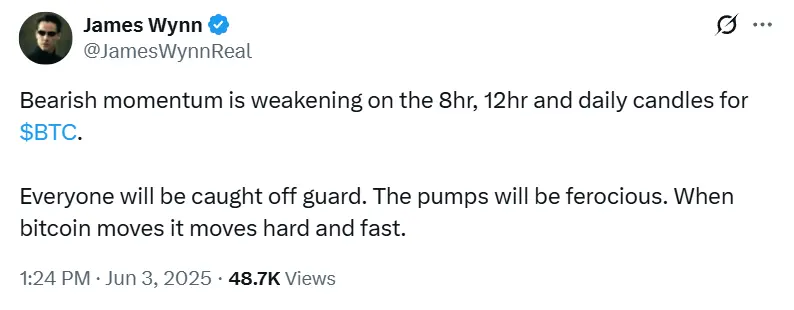 Wynn stated in a follow-up X post on June 3 that “bearish momentum is weakening” and that an impending Bitcoin bounce will surprise investors.