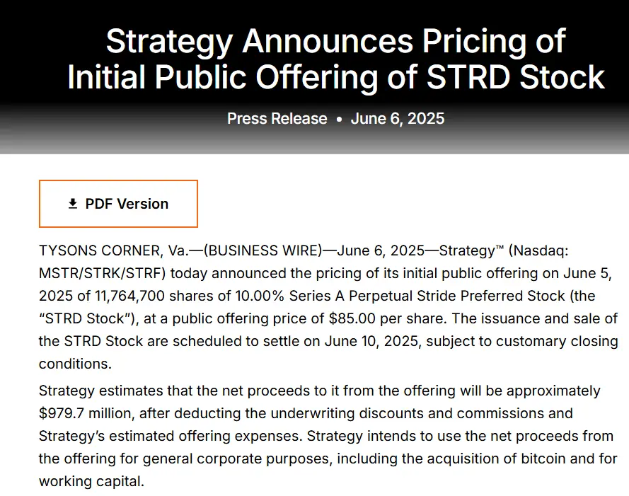 According to a June 6 release, Michael Saylor’s Strategy projects that, after subtracting the underwriting discounts and commissions for the firm’s offering expenditures, the net proceeds will generate approximately $979.7 million.