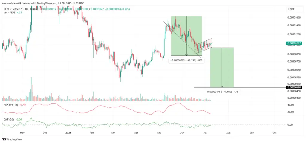The price of Pepe Coin could plummet to $0.00000480 if the same decline occurs today and the coin falls below the support of the ascending channel that forms the flag.