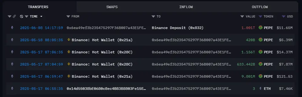 It is possible that a single hoarder sold 1 trillion PEPE tokens after transferring them to Binance.
