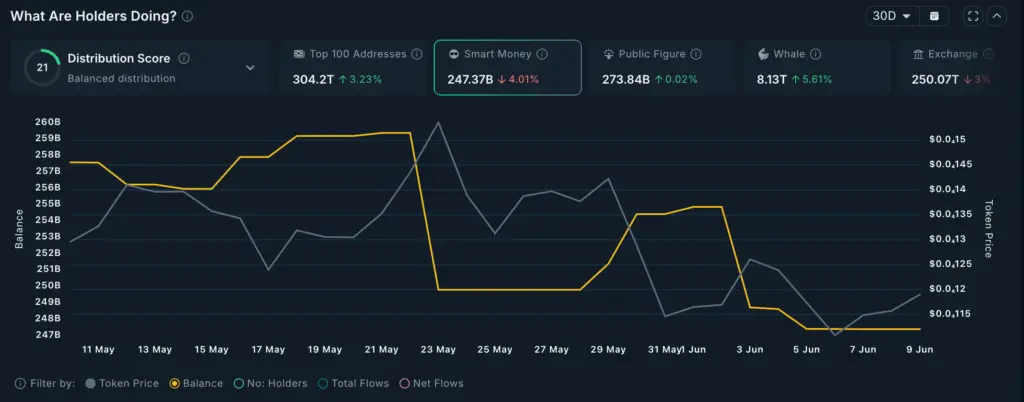 As indicated by Sentiment data, Pepe Coin has been sold by other billionaires.