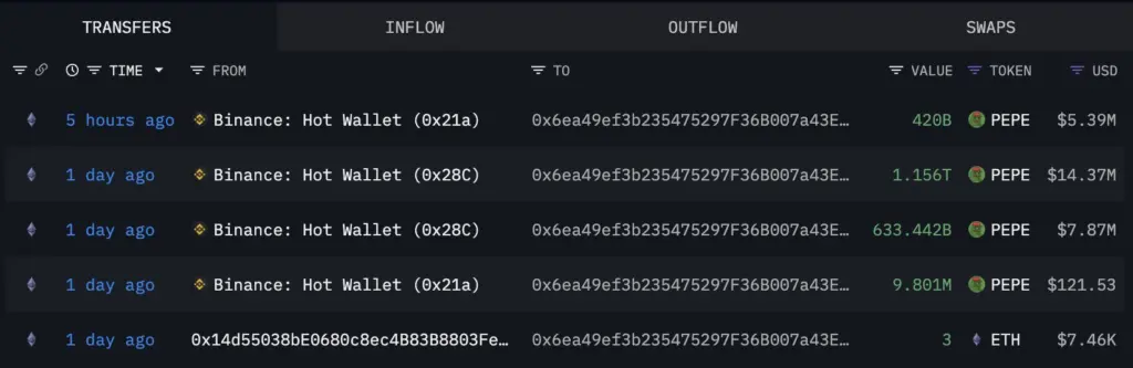 PEPE Trading Experiences a Surge in Activity as a Whale Transfers $29 Million in Tokens from Binance