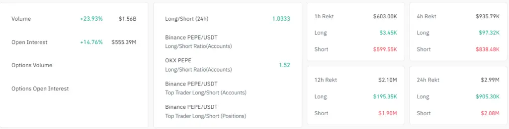 Over the past 24 hours, approximately $2 million in liquidations were experienced by short positions that were wagering against PEPE’s price increase, according to CoinGlass data. Long traders also experienced losses of approximately $907,000.