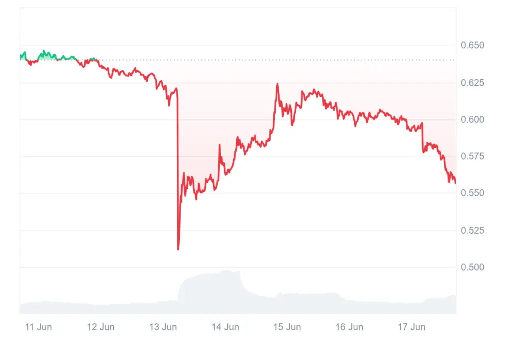 The coin price is unaffected by the excitement surrounding the auction. It has crashed 7% today and is now trading at $0.5578.
