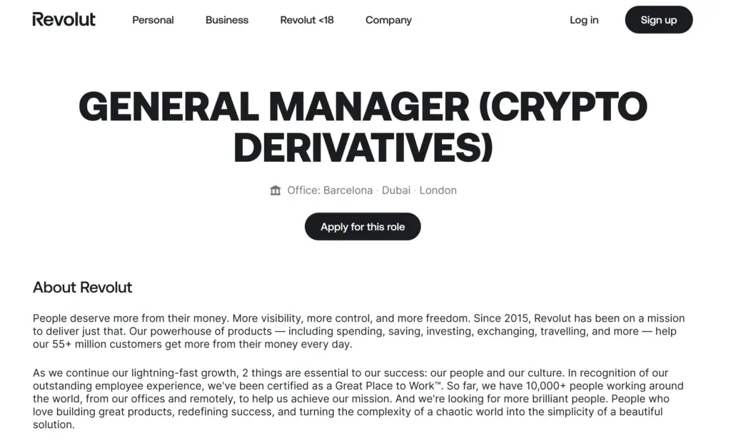 The fintech company is recruiting in London, Barcelona, and Dubai, as evidenced by a recent job posting for the “General Manager (Crypto Derivatives).”