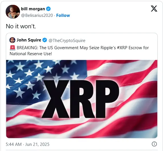 Morgan’s direct response, “No, it won’t,” refuted analyst John Squire’s assertions regarding the potential government expropriation of Ripple’s XRP holdings.
