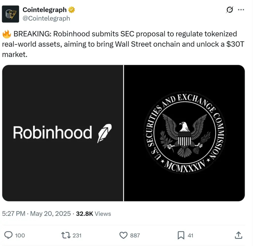 Robinhood submitted a 42-page proposal to the US Securities and Exchange Commission (SEC) to establish a national framework for regulating tokenized real-world assets (RWAs).