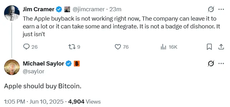 Saylor’s remark addressed Jim Cramer’s critique of the Apple repurchase scheme.