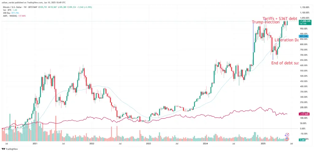 According to TradingView data, Bitcoin has increased by more than 17% throughout that time. Bitcoin has increased by over 1,000% over the last five years, while Apple’s stock has risen by 137%.