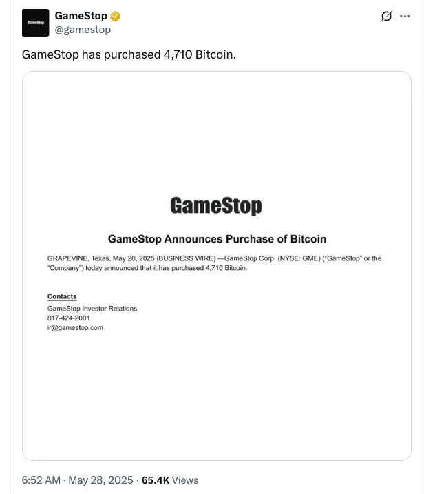 After launching a $1.3 billion convertible notes offering, US video game and consumer electronics giant GameStop revealed its first Bitcoin investment on May 28. The company paid around $513 million for 4,710 BTC.