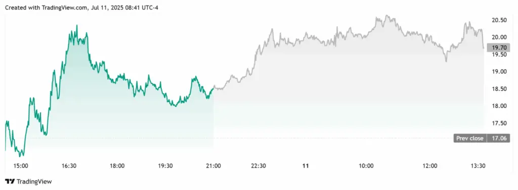 According to TradingView data, the stock completed yesterday’s trading session at $18.48 and is now trading at about $19.72.