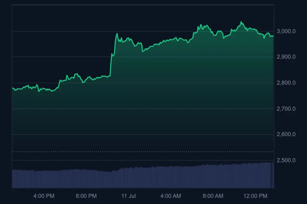 According to CoinMarketCap data, ETH has increased by more than 7% over the past day and is trading just below the psychological $3,000 mark.