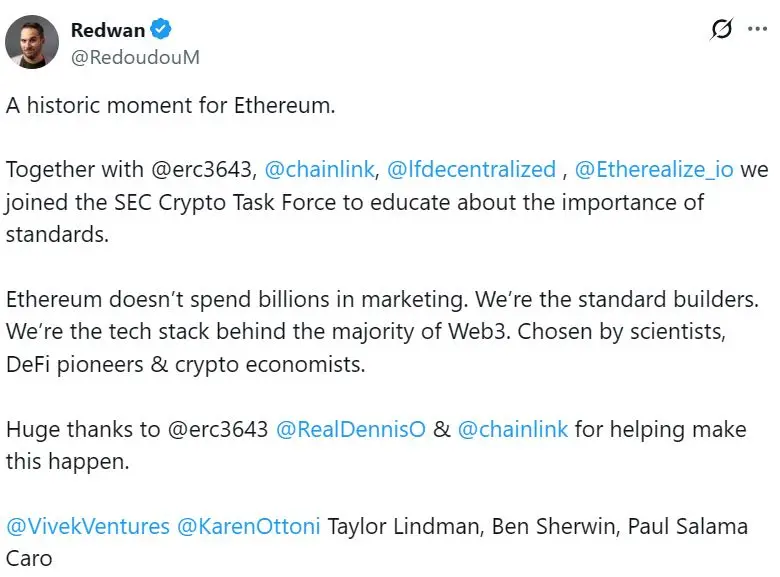 The ERC-3643 Association, Chainlink Labs, the Enterprise Ethereum Alliance, and the Linux Foundation (LF) Decentralized Trust are among the Ethereum-aligned organizations that met with the SEC’s Crypto Task Force on Thursday.