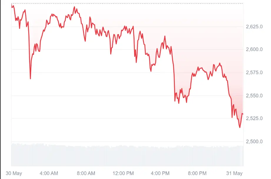 Ethereum Drops Below $2,530 Amid Rising Trading Volume