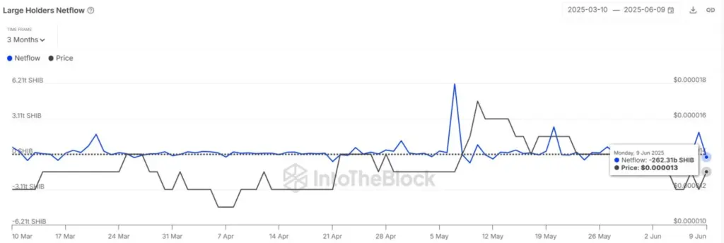 Shiba Inu’s large holder netflows have also reversed negative, presently at -262 billion SHIB, according to IntoTheBlock data.