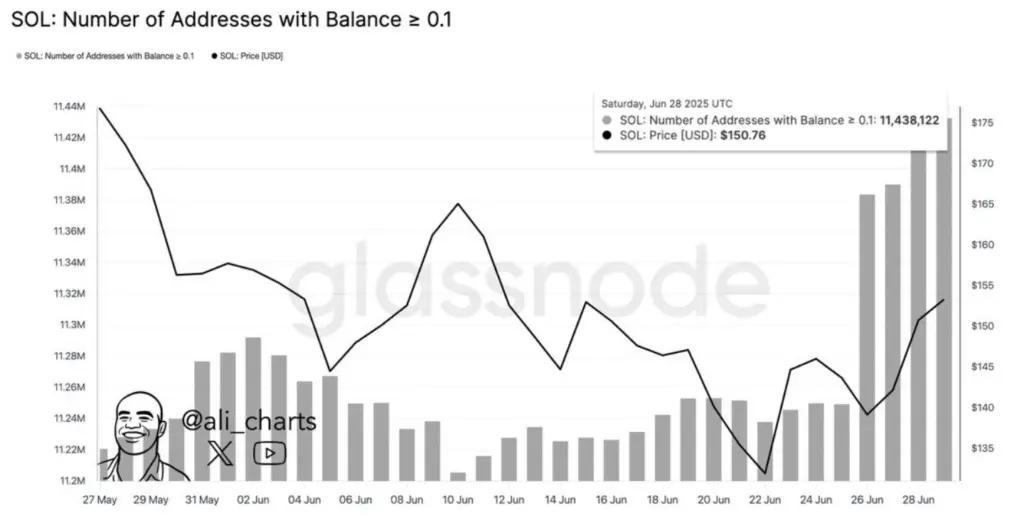 The addresses that contain more than 0.1 SOL tokens have surpassed 11.44 million, setting a new record, according to Glassnode data.