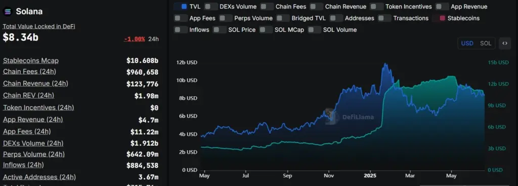 Although the price decline of SOL is consistent with the overall trajectory of the altcoin market, it is currently exposed to additional downside risks. The Total Value Locked (TVL) on the Solana network is $8.34 billion, a significant decrease from the peak of $1.98 billion in January, according to data from DeFiLlama.