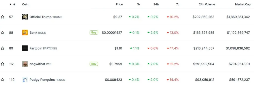 The average value of the top five meme coins on the network has decreased by 10% over the past seven days. Additionally, the market interest in these tokens is diminishing, as no trading volume has been recorded exceeding $300 million in the past 24 hours.